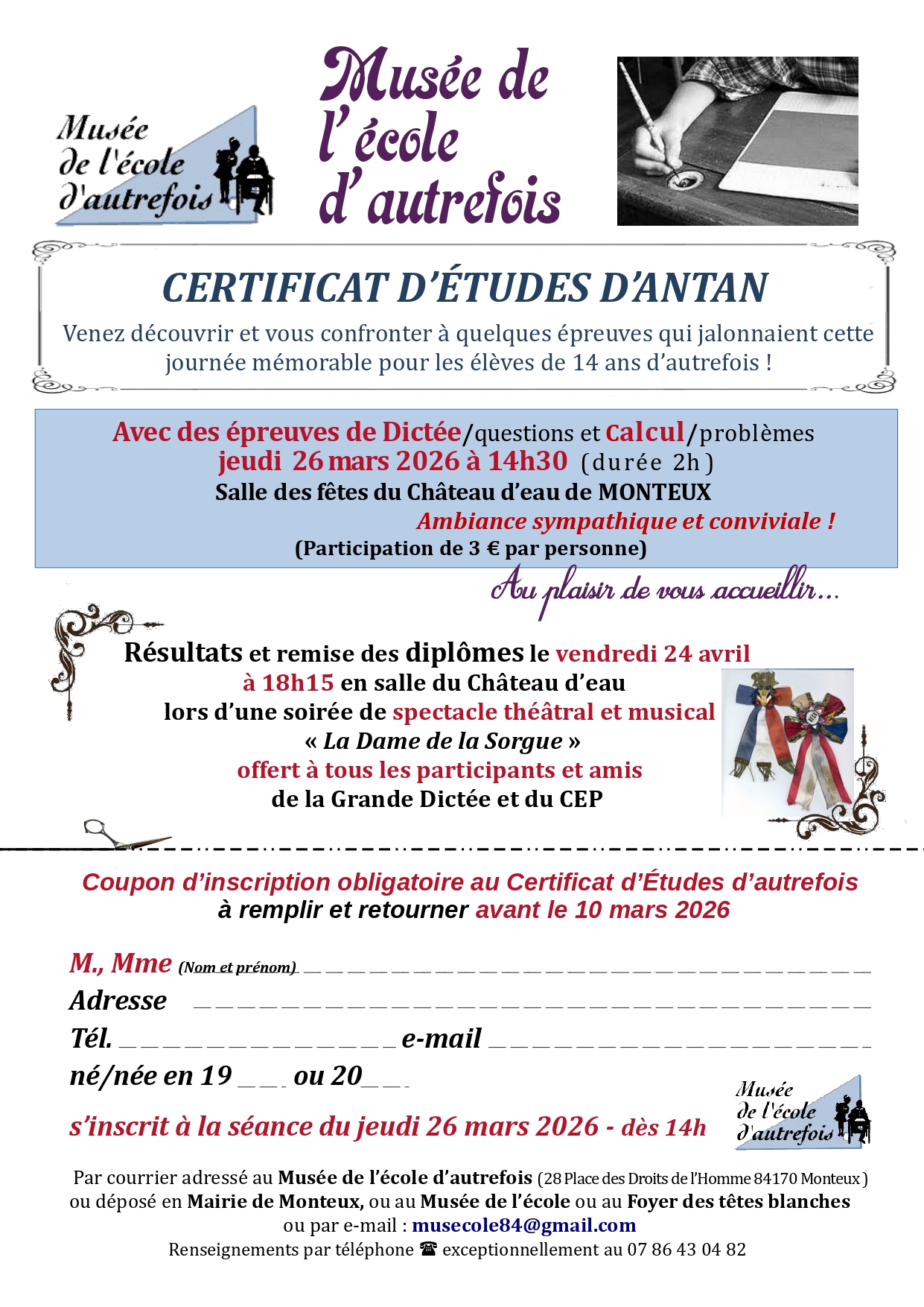 Les résultats et la remise des diplômes aura lieu le vendredi 24 avril à 18h15 à la salle du Château d'eau lors d'une soirée de spectacle théâtral et musical 'la Dame de la Sorgue'.