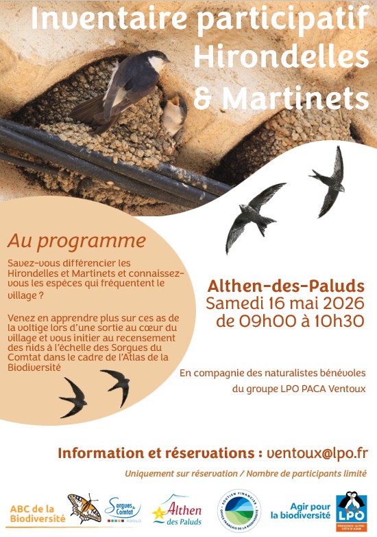 Venez en apprendre plus sur ces as de la voltige lors d'une sortie au coeur du village et vous initier au recensement des nids à l'échelle des Sorgues du Comtat dans le cadre de l'Atlas de la Biodiversité.
