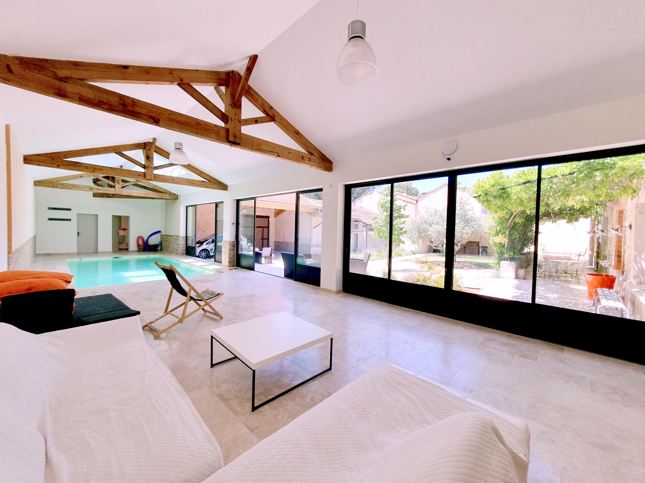 Découvrez le Mas du Couchadou à Pernes-les-Fontaines : 6 chambres, 7 salles de bain, piscine intérieure chauffée, cour privée, parking 3 voitures, clim, aucun vis-à-vis.