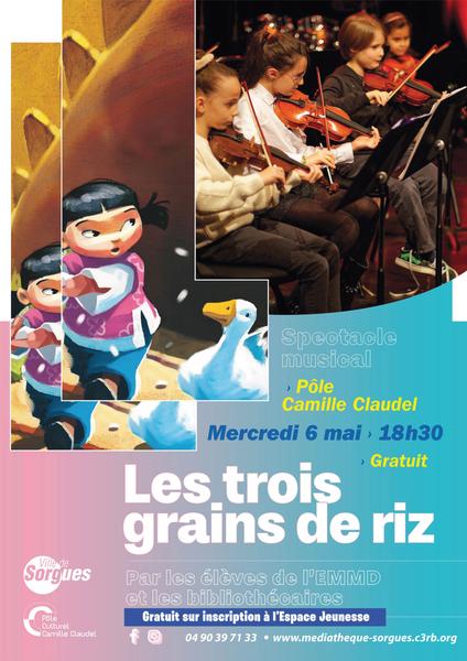 Fruit d’une joyeuse collaboration, cette nouvelle création collective vous propose une lecture musicale du conte « Les trois grains de riz », écrit par Agnès Bertron-Martin et illustré par Virginie Sanchez (Éditions Père castor).